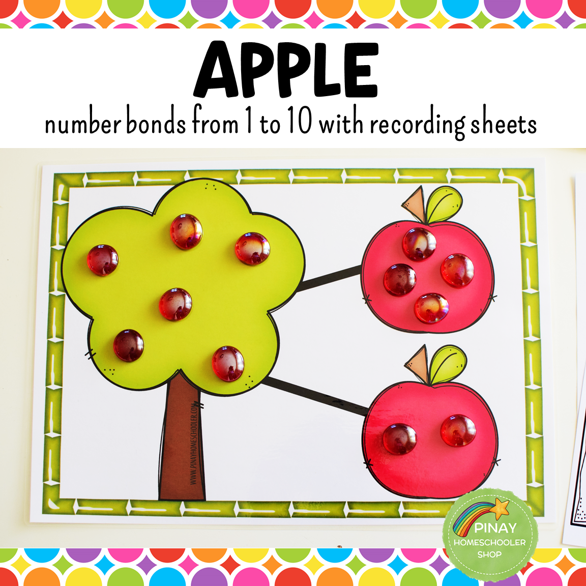 This "apple-themed" learning set is perfect for learning about number bonds! The learning material will aid kids and students in understanding the concept of parts of a whole, basic addition, subtraction, and number recognition.