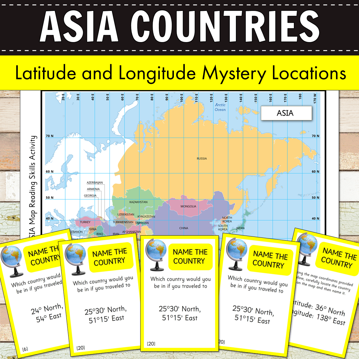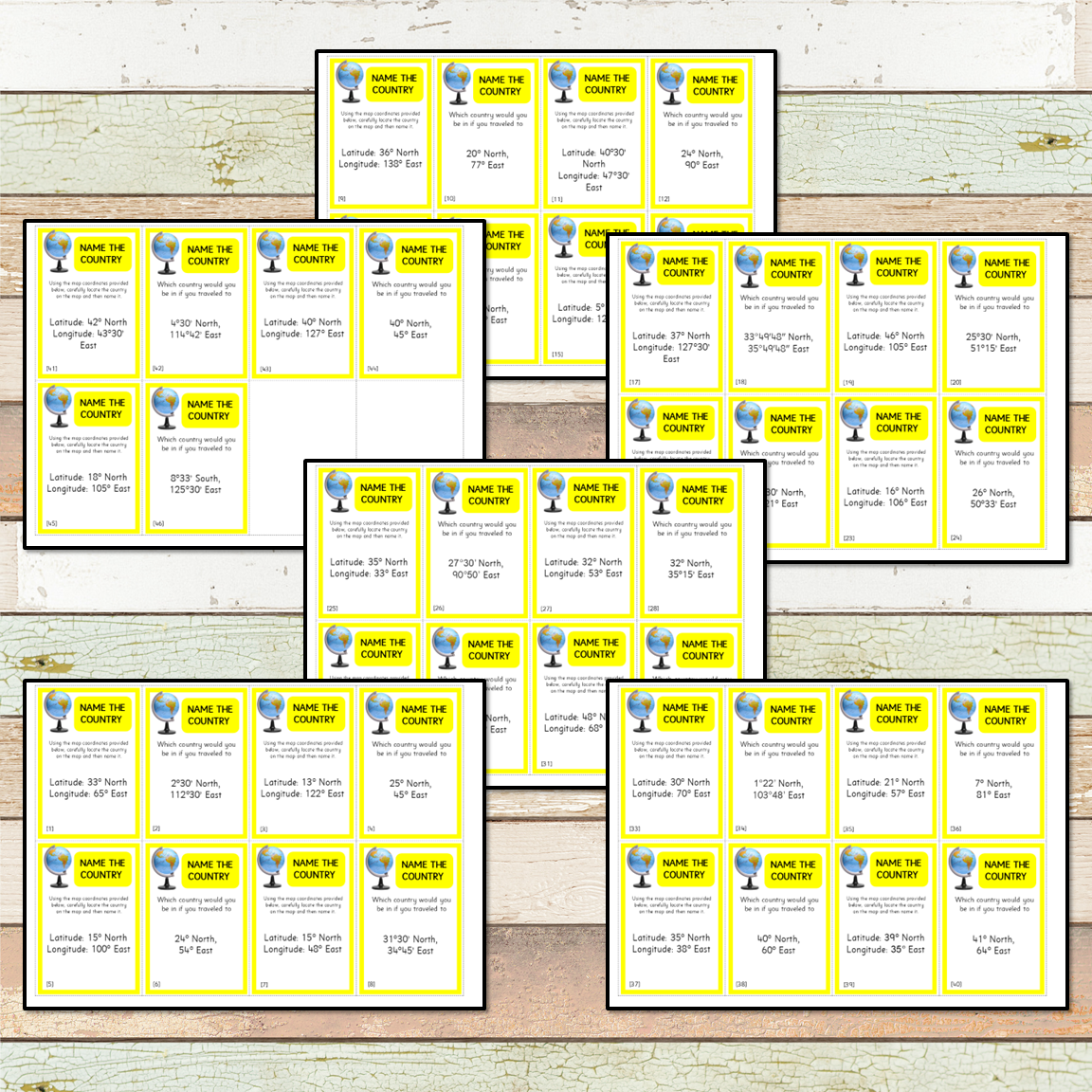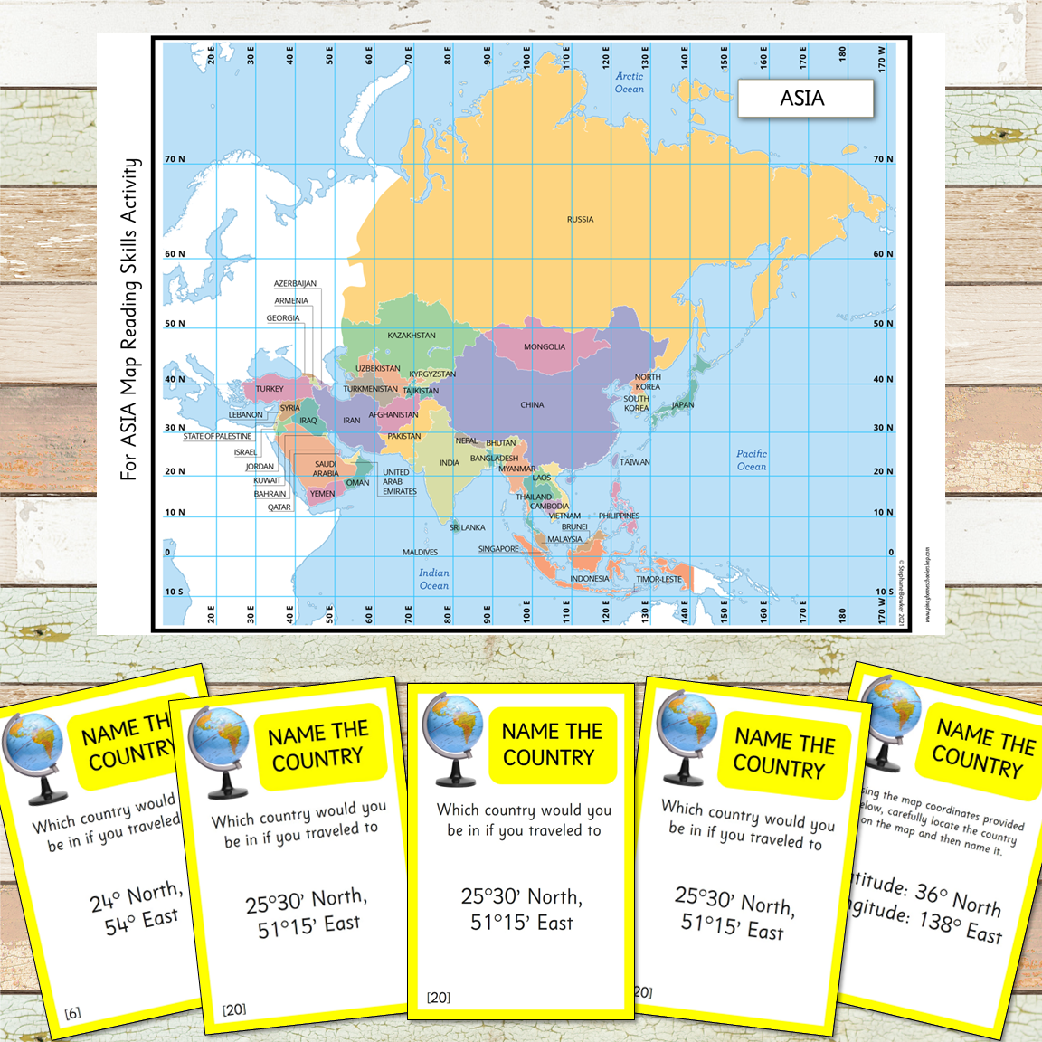 The printable pack features 46 task cards with coordinates of various countries in Asia. Students will have the opportunity to locate these specific places on a map using the provided coordinates. Additionally, the pack includes two differentiated recording sheets and control cards to support the learning process. Furthermore, it comes with a map of Asia that includes lines of latitude and longitude, although users also have the option to use their own map.