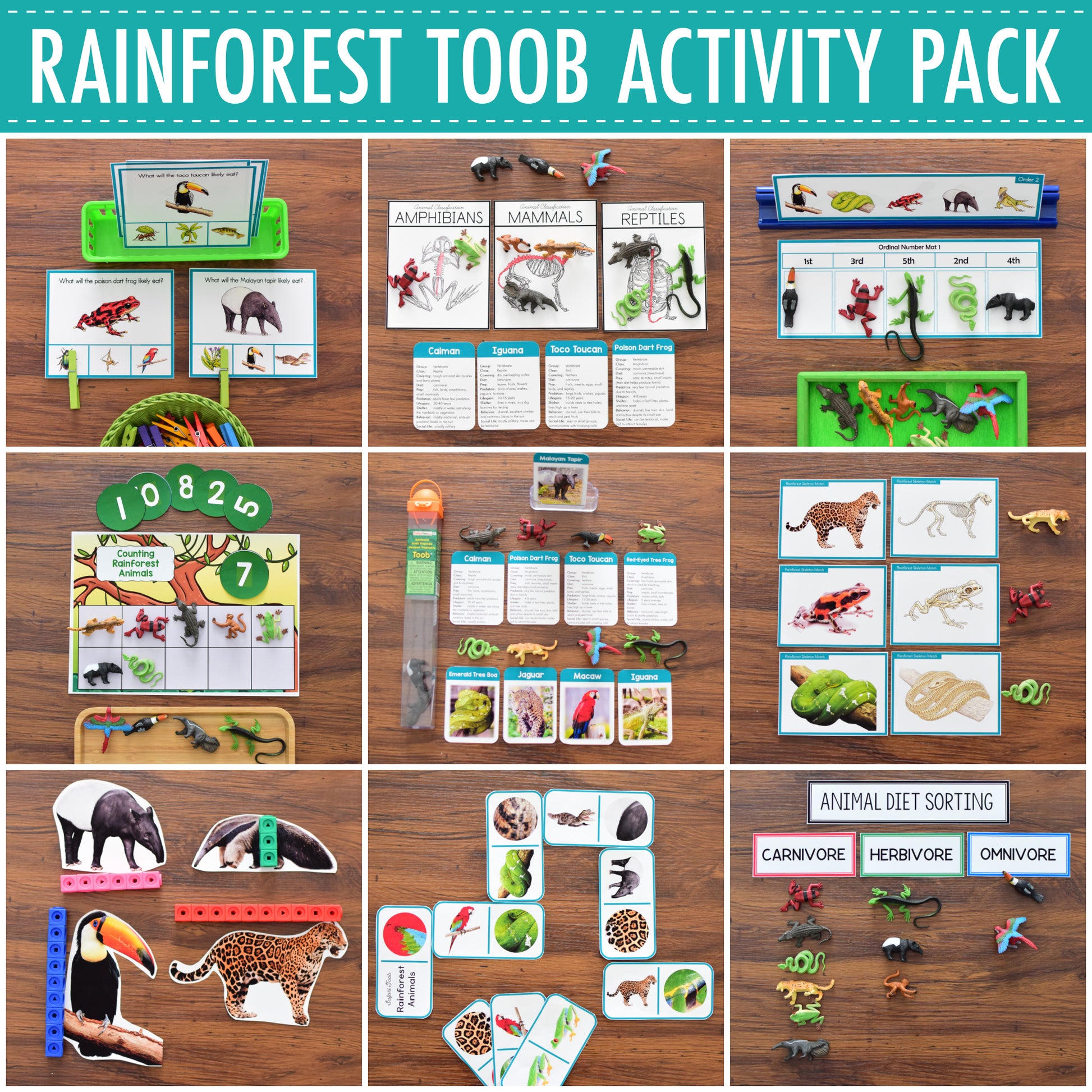 This is a Montessori-inspired learning activity designed to accompany the Safari Toob Rainforest educational toob set. This is designed for preschoolers, pre-kindergarten, kindergarten, and first-grade students and is perfect for a Montessori environment. You will love the high-quality, real images that are used in this set.