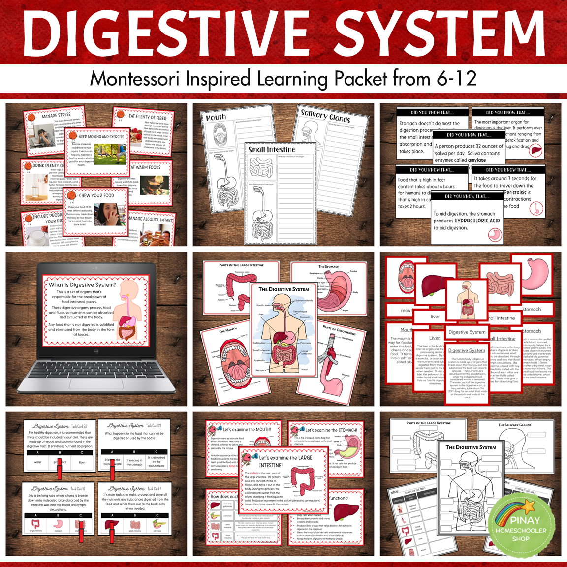 This is a Montessori-inspired learning packet designed for kids 6-12 years old (or older) to learn the DIGESTIVE SYSTEM of the human body. This pack provides kid-friendly, fun and engaging activities with lots of visual materials, activity sheets, and writing prompts for older students.