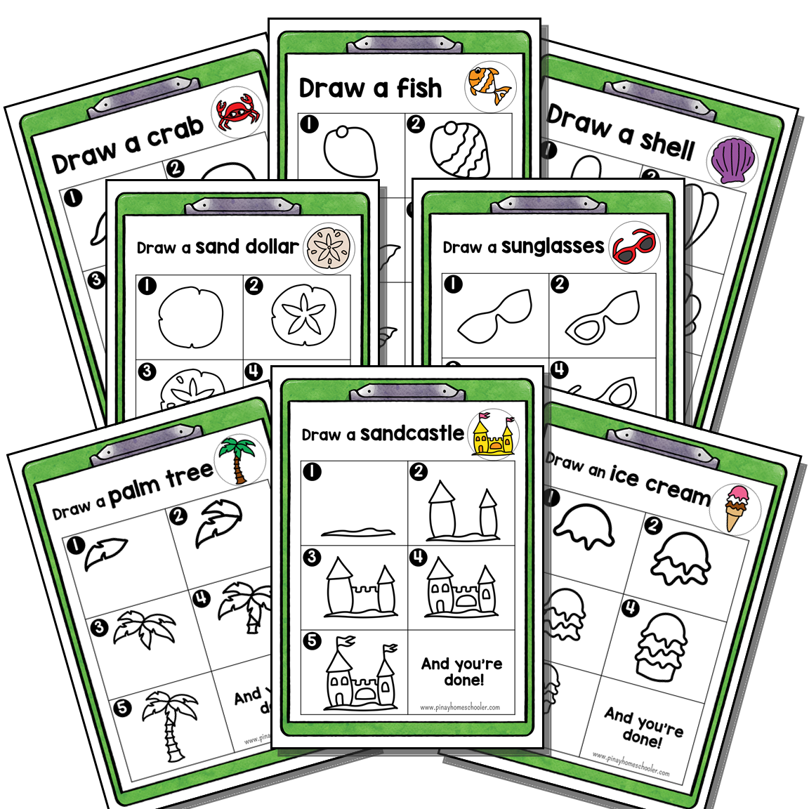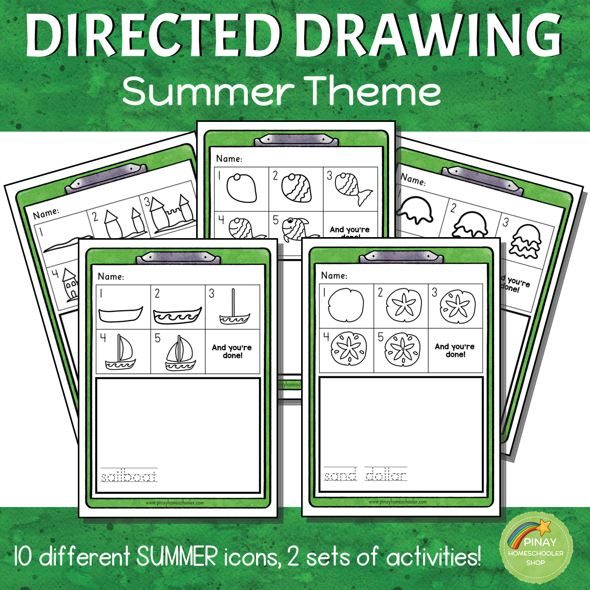 - 10 DIRECTED DRAWING CHARTS. These sheets will serve as a guide and provide the steps on how to draw summer icons/objects on a bigger scale. Blank drawing sheets are provided.