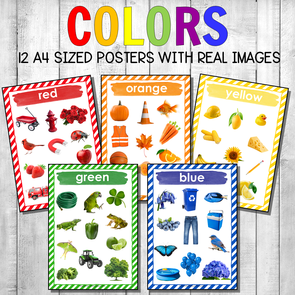 Montessori color posters for introducing and learning colors to young children and little learners! There are 12 A4 sized posters included in this pack, all with real images of animals, flowers and objects. These are perfect as classroom wall decors, home school, playrooms, or printed into smaller cards!