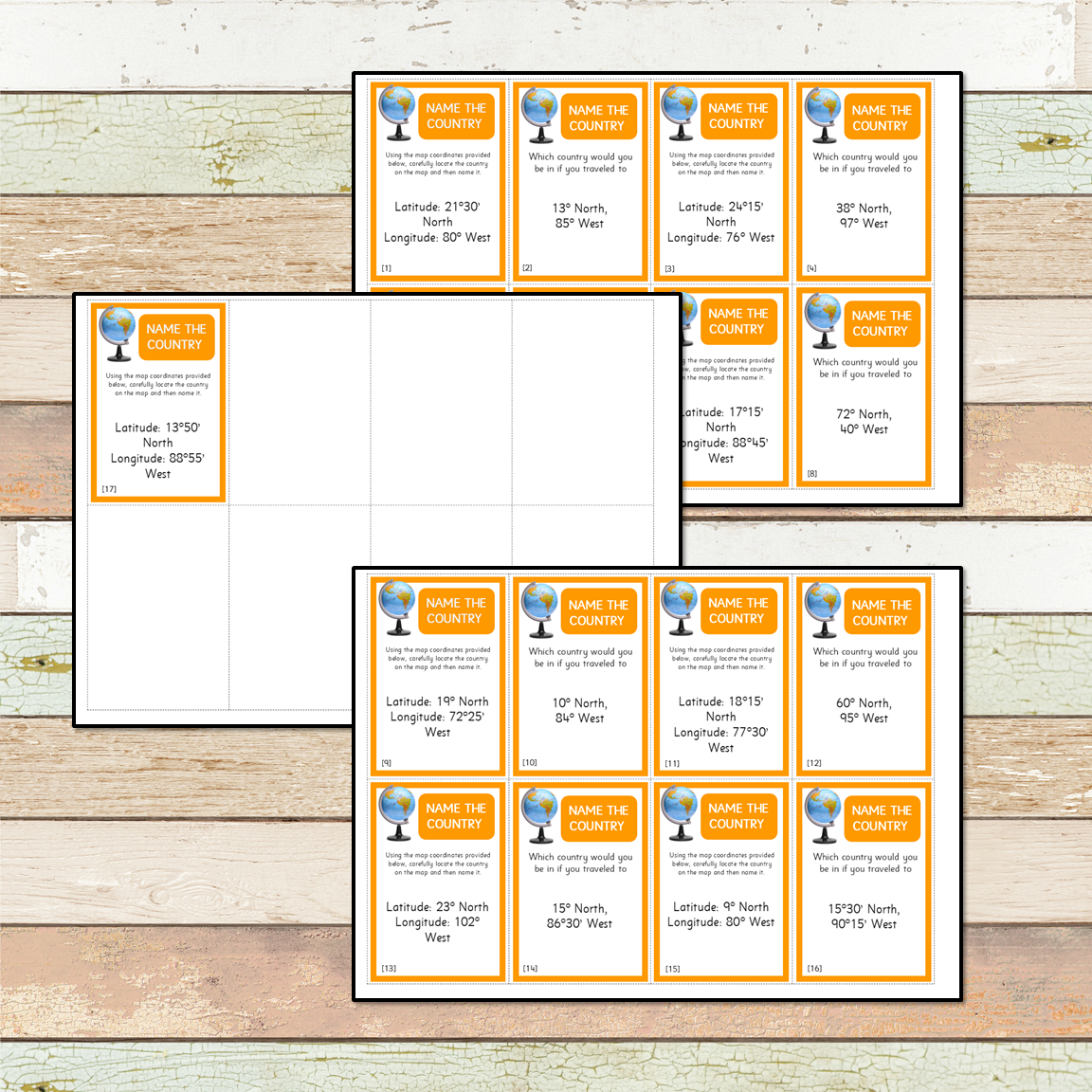 The printable pack features 17 task cards with coordinates of various countries in North America. Students will have the opportunity to locate these specific places on a map using the provided coordinates. Additionally, the pack includes two differentiated recording sheets and control cards to support the learning process. Furthermore, it comes with a map of North America that includes lines of latitude and longitude, although users also have the option to use their own map.