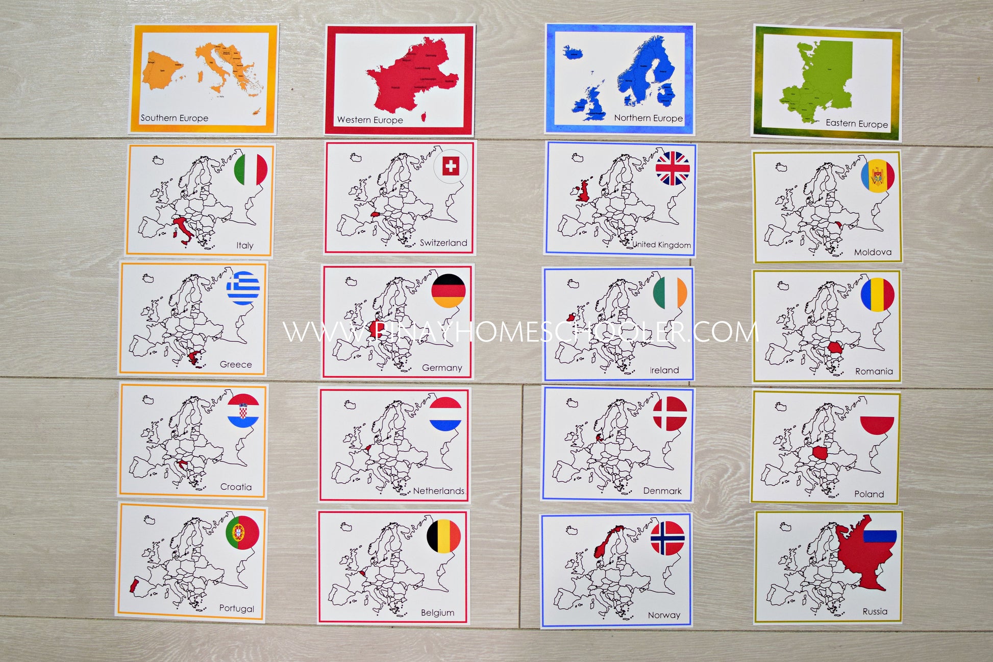 - Regions of Europe Montessori 3 part cards in red border and no border versions