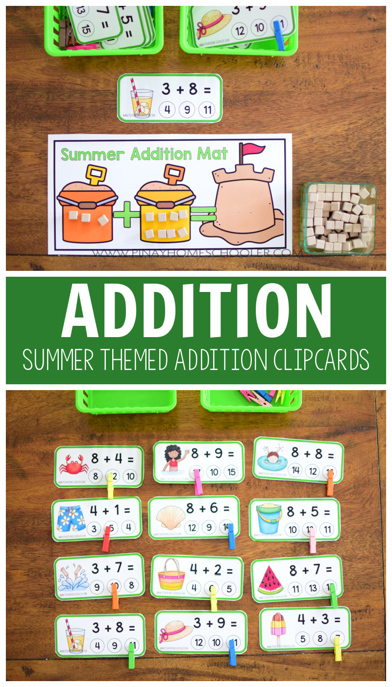 Get ready to practice addition this summer with these lovely Montessori-inspired summer addition clip card strips! These are ideal for preschoolers and kindergartners developing an interest in adding two numbers. Utilize these cards with any available manipulatives for hands-on learning and retention.