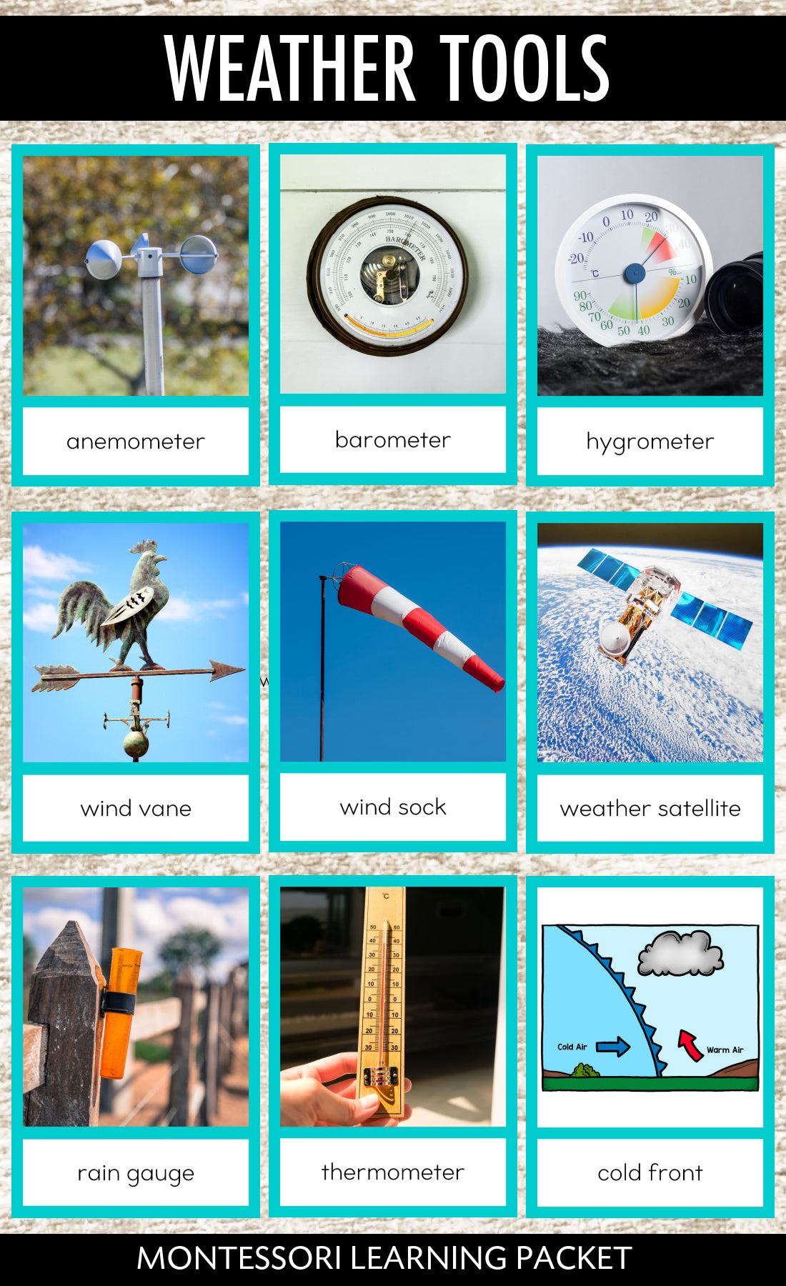 This Montessori Weather Tools and Forecasting Cards contains resources for introducing and learning about weather tools and basic weather forecasting. It features anemometer, rain gauge, hygrometer, barometer, thermometer, wind sock, wind vane, weather satellite, cold front, warm front, high pressure, low pressure, weather map, weather forecast.